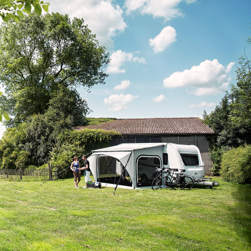 - De luifel wordt gemonteerd door de aangenaaide pees in de caravanrail te schuiven. Boren is niet nodig